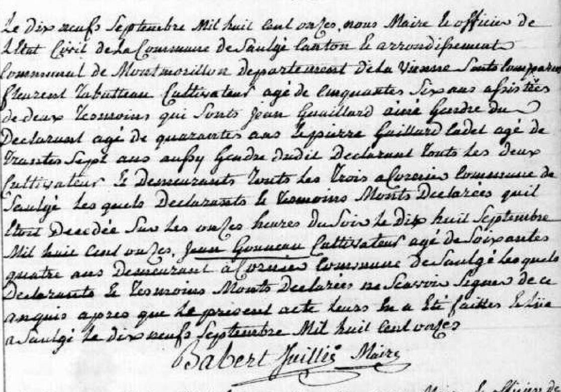 | Décèdé | le 18 Septembre 1811 à SAULGE,86254,Vienne,Poitou Charentes,France |